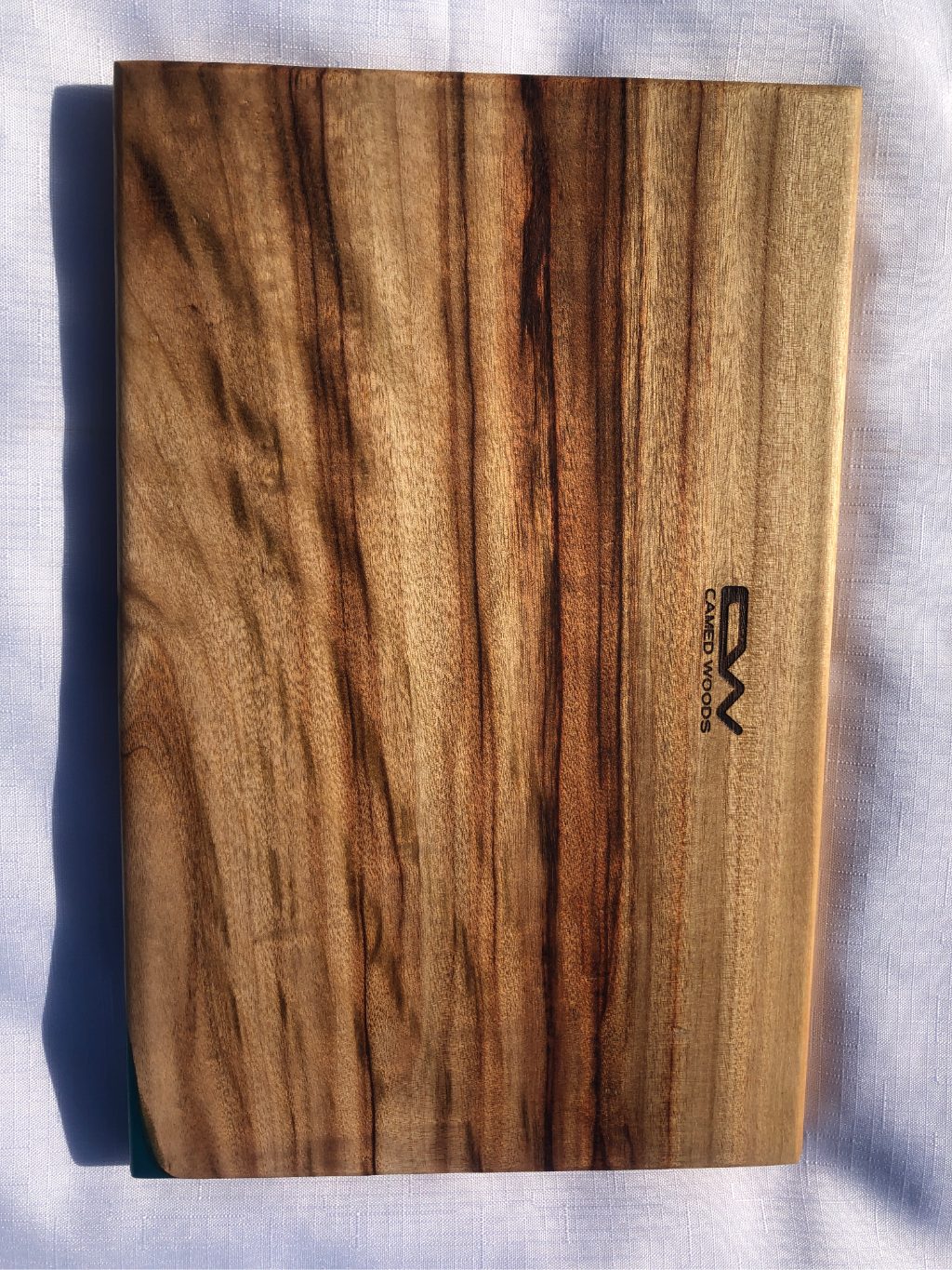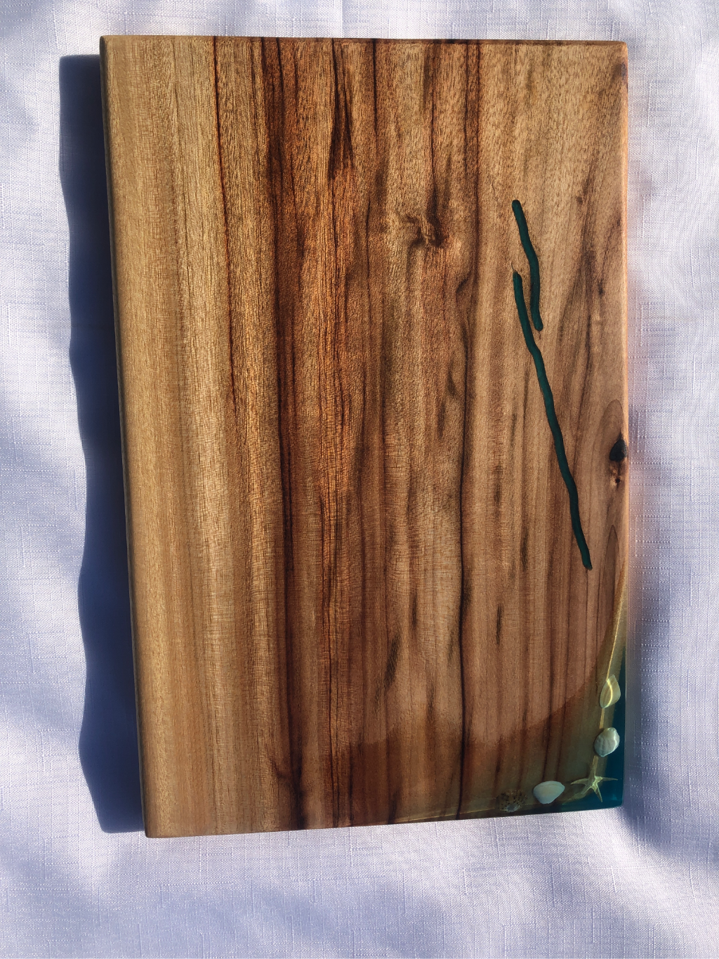 Camphor Laurel timber board with a seashell and starfish corner feature made from epoxy resin.