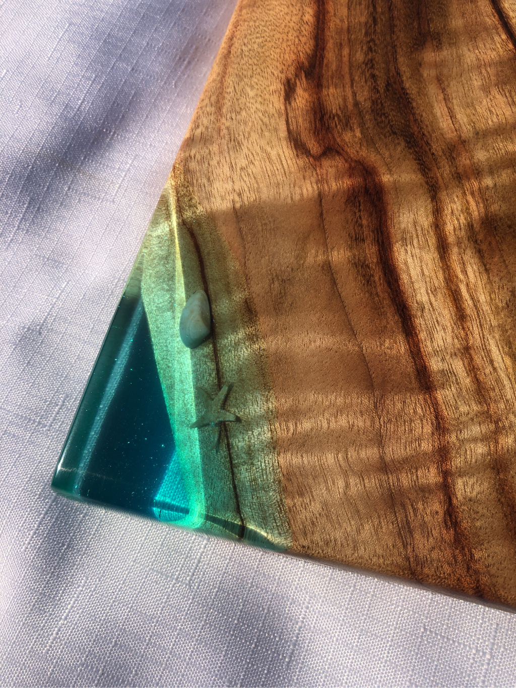 Beautiful Camphor Laurel and epoxy resin beach design with Australian seashells and starfish.